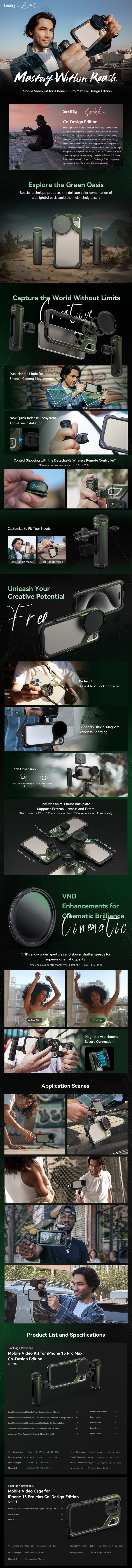 SmallRig x Brandon Li Mobile Video Kit für iPhone 15 Pro Max Co-design Edition 4407B enthält zwei Griffe, um stabile Video- und Vlogging-Aufnahmen zu gewährleisten; die drahtlose Steuerung ermöglicht "One-Click"-Aufnahmen. Der Käfig verfügt über mehrere 1/4"-20-Gewindebohrungen und Cold Shoes zur Befestigung von Griff, Stativ, Mikrofon, LED-Videoleuchte usw. Sie alle sind mit dem neuen SmallRig Quick Release Ecosystem ausgestattet, das einen einfachen und schnellen Wechsel zwischen horizontaler und vertikaler Ausrichtung der Kamera ermöglicht. Insbesondere der Käfig ist dezent ausgehöhlt, um vollen Zugang zu den Tasten, Anschlüssen, dem Radar und dem Ultra-Weitwinkelobjektiv des iPhones sowie zum drahtlosen MagSafe-Ladegerät zu ermöglichen. Da der Käfig komplett aus Metall besteht, ist er außerdem mit integrierten Pads ausgestattet, die Stöße und Kratzer verhindern. Das Kit enthält auch einen Filterringadapter und einen VND-Filter ND2-ND32 (5 Stop), um das Bild weicher und filmischer zu machen. Die besondere Farbe und das Herstellungsverfahren sowie die exquisite Signatur von Brandon Li verleihen Ihnen zweifellos ein einzigartiges Gefühl der Exklusivität.
