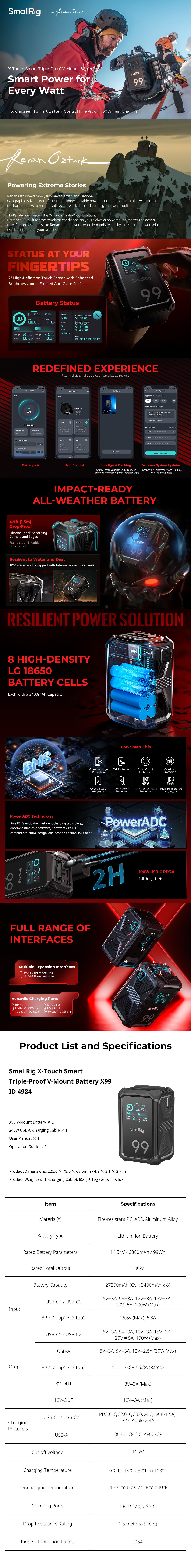 Der SmallRig X-Touch Smart Triple-Proof V-Mount-Akku X99 4984 setzt neue Maßstäbe für professionelle Stromversorgungslösungen, indem er intelligente Technologie, robusten Schutz, leistungsstarke Schnellladung und Vielseitigkeit mit mehreren Anschlüssen vereint und damit ideal für anspruchsvolle Aufnahmeumgebungen ist.