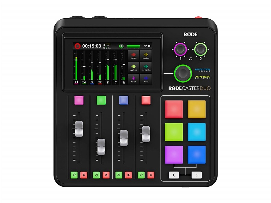 kompakter Studio-Mixer für Podcasts und Streaming, 2 analoge Eingänge – Mikrofon/Line/Instrument, 2x Kopfhörerausgang, 1x Headset-Eingang, Ausgang für Audiomonitore, 2x USB-C, Wi-Fi, Ethenet, Bluetooth®, Empfänger für RØDE Wireless, 4 physische und 3 virtuelle Fader, Touch-LCD-Display, APHEX®-Prozessoren, RØDE FX-Effekte