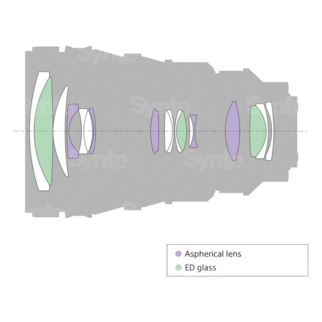 fokussiert und eine 0,15-fache Bildvergrößerung bietet.Es besteht aus 18 Linsen, die in 12 Gruppen angeordnet sind. Das optische System verwendet 5 speziell geformte Linsen mit asphärischer Oberfläche und 3 Linsen aus speziellem ED-Glas mit geringer Dispersion.