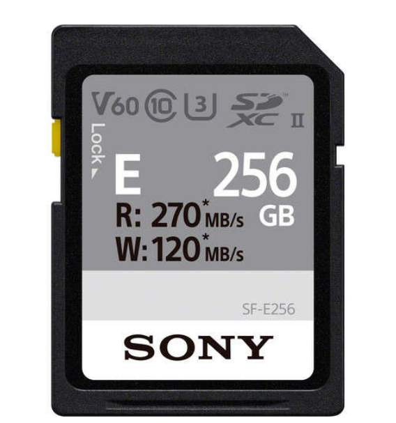Die Sony SDXC SF-E 256 GB UHS-II V60 Speicherkarte bietet eine hohe Leistung mit Lesegeschwindigkeiten von bis zu 270 MB/s und Schreibgeschwindigkeiten von bis zu 120 MB/s und eignet sich ideal für 4K-Videos und Hochgeschwindigkeitsfotografie.