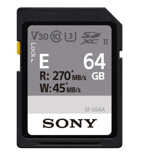 Die Sony SDXC-Speicherkarte der SF-E-Serie mit 64 GB und UHS-II-Unterstützung bietet hohe Leistung für Foto- und Videoaufnahmen und unterstützt 4K-Aufnahmen, Serienaufnahmen sowie eine zuverlässige Hochgeschwindigkeits-Datenübertragung.