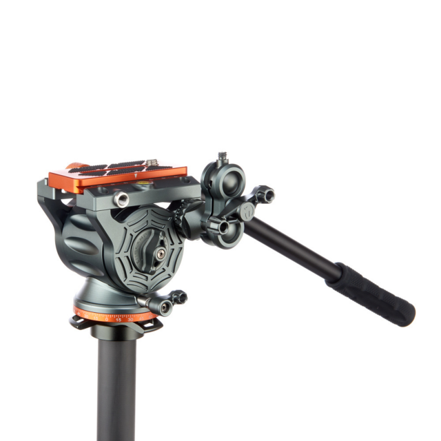 Außerdem verfügt der Kopf über einen einstellbaren Kippmechanismus, der eine reibungslose Bewegung ermöglicht. Dieser Mechanismus kann entweder geradeaus oder über den mitgelieferten Schwenkarm gesteuert werden, der auf beiden Seiten des Kopfes angebracht werden kann, so dass er sowohl von Rechts- als auch von Linkshändern bedient werden kann. Der Kopf verfügt über eine Friktionssteuerung für den Neigemechanismus, einen gerändelten Klemmknopf für besseren Halt, einen Hebeleffekt und eine gerändelte Basis, die um 361° drehbar ist und bei Bedarf arretiert werden kann. Dadurch eignet sich der Kopf sowohl für horizontale als auch für vertikale Aufnahmen, was Sie besonders bei der Aufnahme verschiedener Gebäude, des Himmels oder einer großen Menschengruppe zu schätzen wissen werden.