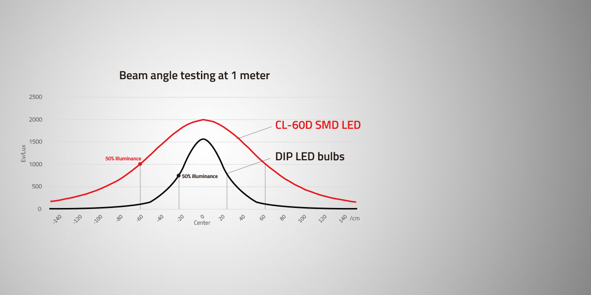 Die SMD-LEDs haben im Vergleich zu herkömmlichen DIP-LED-Lampen einen größeren Abstrahlwinkel. Sie erzeugen ein gleichmäßig verteiltes Flächenlicht von der Mitte bis zum Rand, anstatt eines grellen Lichtflecks, der von der Mitte zum Rand hin plötzlich abfällt.