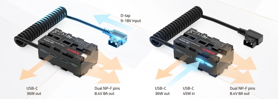 Der Dummy-Akku DB-DF570 unterstützt eine D-Tap-Stromeingabe von 9–18 V oder eine USB-C-PD-Eingabe von 45 W und wandelt diese in eine geregelte 8,4-V-8-A-Ausgabe über zwei NP-F-Pins und eine USB-C-PD-Ausgabe von 36 W um.