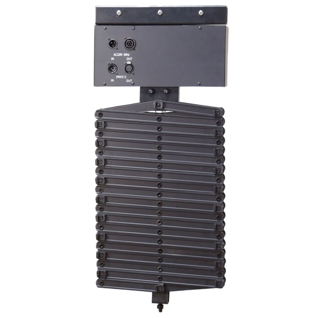 Auf der Rückseite befinden sich ein AC 100-240V, 50/60Hz Ein- und Ausgang, PowerCON True1 Anschlüsse und ein DMX 5-pin XLR Eingang und Ausgang für serielle Verbindungen.