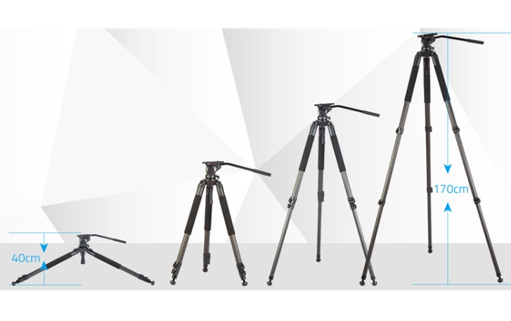Die 3-teiligen Beine sind von 40 cm bis 170 cm höhenverstellbar und lassen sich in einem Winkel von 25° bis 75° neigen, während der leichtgängige Fluidkopf bis zu 10 kg trägt und über ein dynamisches Gegengewicht für präzise Kamerabewegungen verfügt. Das Stativ bietet einen Schwenkbereich von 360° und einen Neigungsbereich von -75° bis +90° und eignet sich somit für eine Vielzahl von Aufnahmewinkeln.