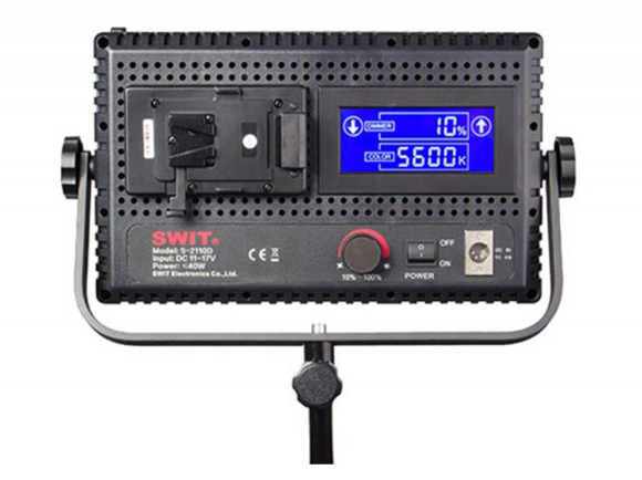 Die Stromversorgung ist flexibel und erfolgt über V-Mount- oder Gold-Mount-Akkus oder den mitgelieferten AC-DC-Adapter, während die U-förmige Halterung und die Stativbefestigung eine einfache Positionierung am Set ermöglichen. Das S-2110DS ist leicht und dennoch robust, tragbar und ideal für vielseitige professionelle Beleuchtungsaufbauten.