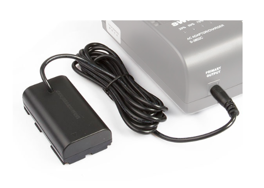 Der SWIT S-7500E ist ein Dummy-Batterieadapter vom Typ Canon LP-E6 mit einem 5,5/2,1-mm-DC-Polkabel,