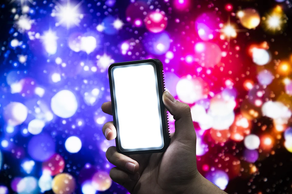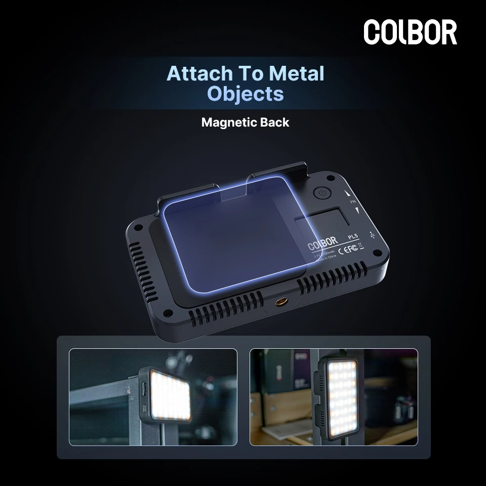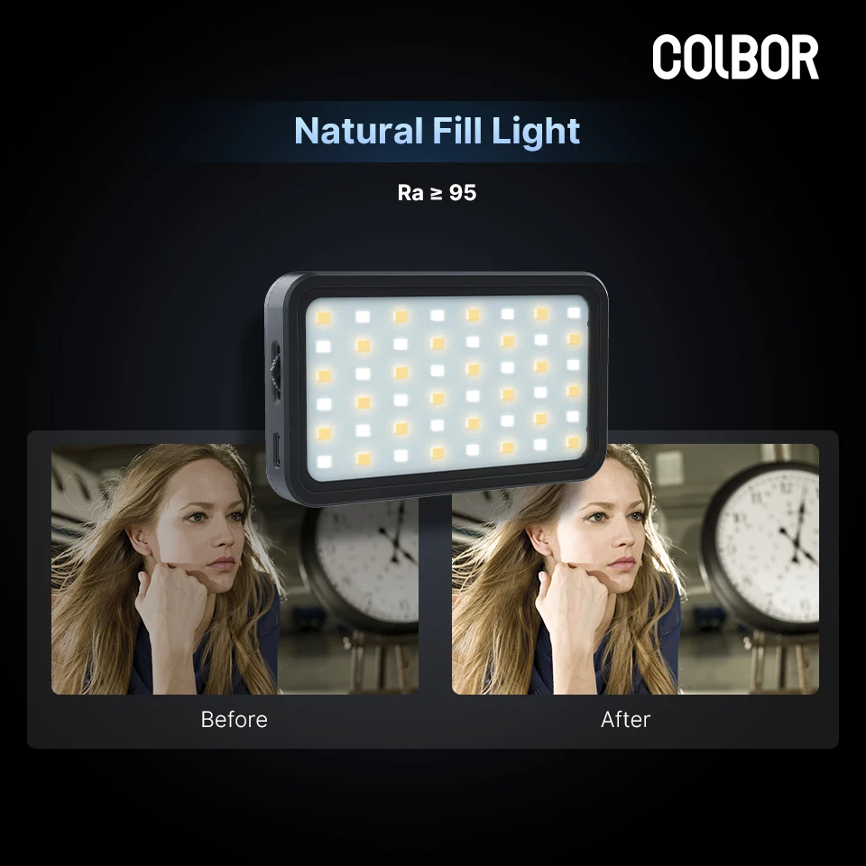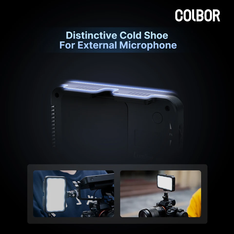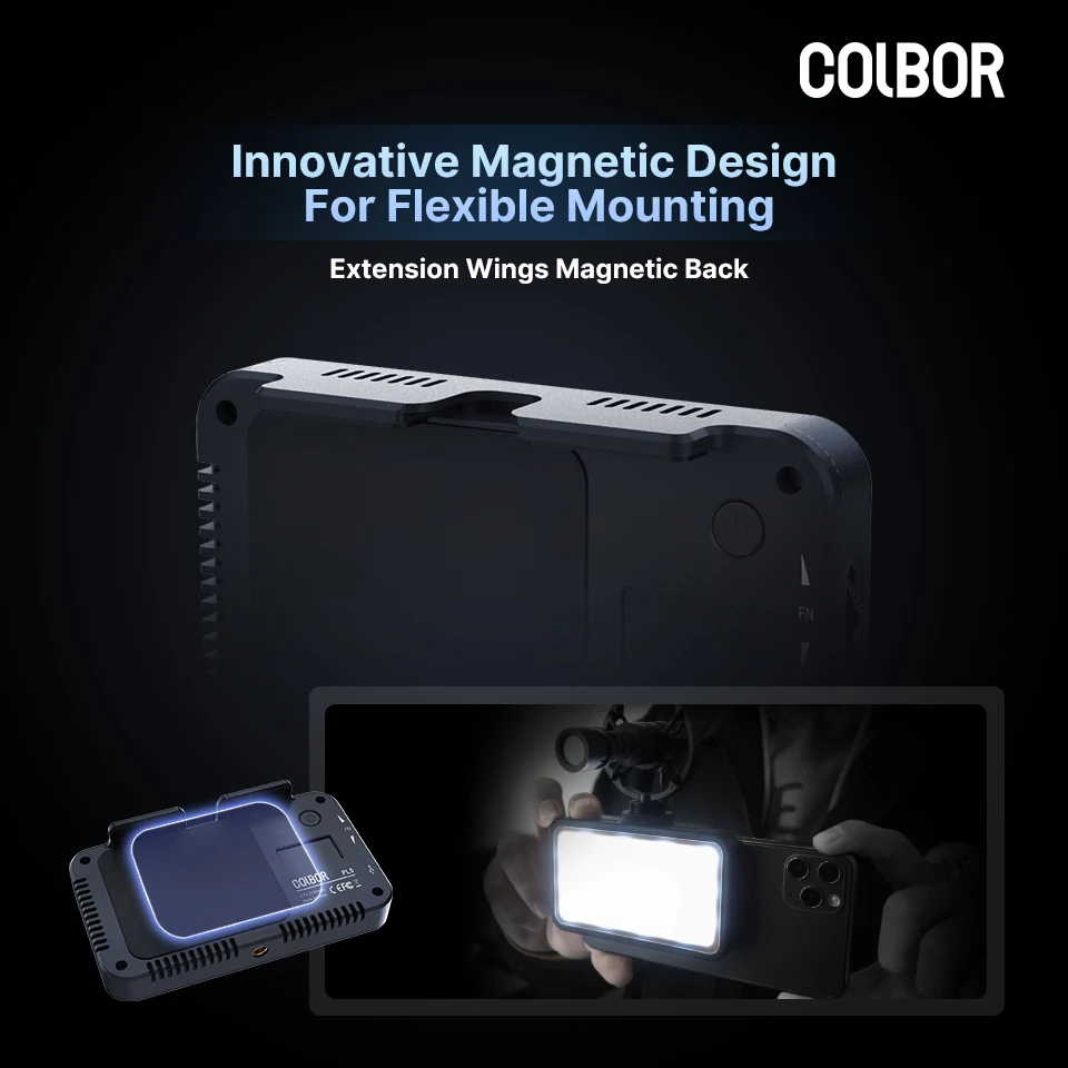 Auf der Oberseite der Leuchte hat COLBOR zwei Verlängerungsflügel für die meisten Mobiltelefone angebracht, was in seiner Art innovativ ist und eine stabile Aufhängung am Smartphone ermöglicht. Die magnetische Rückseite und die Metallplatten sorgen dafür, dass die Leuchte fest auf dem Handy sitzt, ohne dass eine zusätzliche Stütze erforderlich ist. Ein kalter Schuh zwischen den Flügeln dient zum Anbringen eines externen Mikrofons.