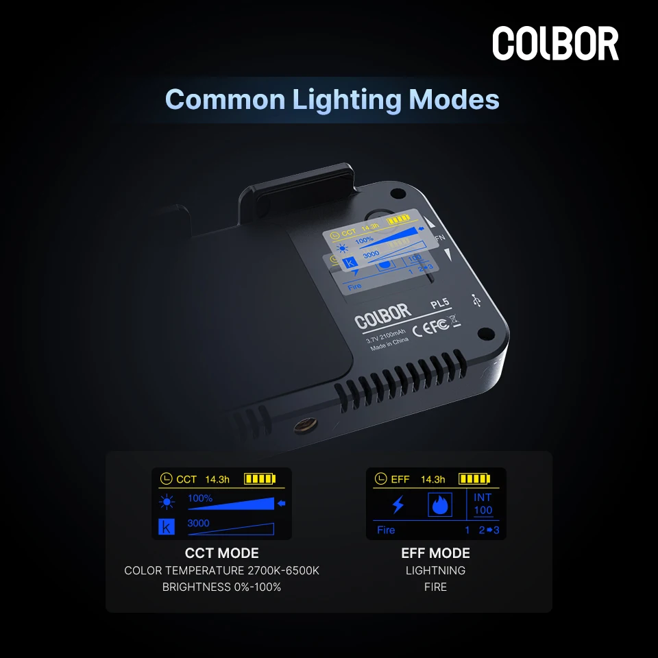 Die LED-Videoleuchte bietet typische Beleuchtungsmodi für einen besseren visuellen Effekt. Im CCT-Modus bietet der breite Farbtemperaturbereich von 2700K-6500K warmes oder kaltes Licht bei 0%-100% Helligkeit. Sie können die am besten geeignete Einstellung für verschiedene Anforderungen finden, z. B. für Porträt-, Natur- und Produktaufnahmen. Der EFF-Modus mit spezieller Beleuchtung, Blitzen und Feuer simuliert die entsprechende Atmosphäre.