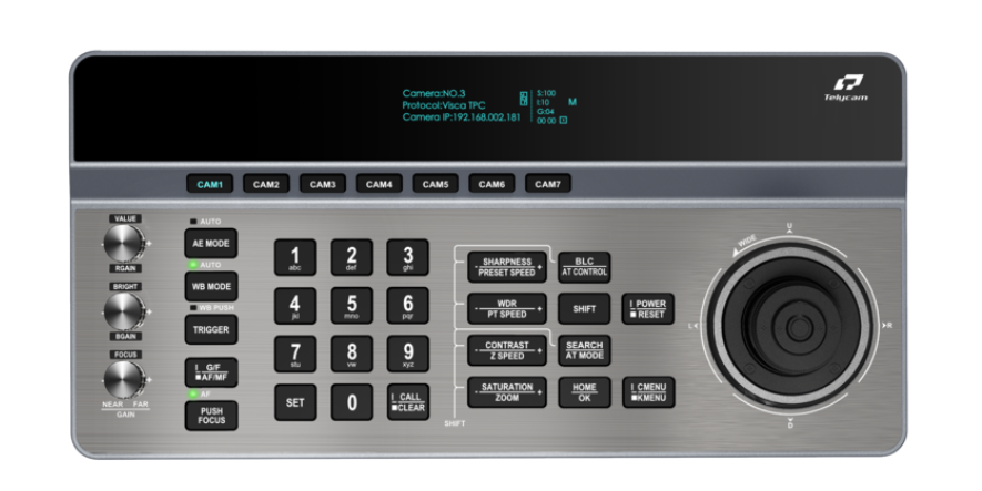 Ein integriertes 3,12-Zoll-OLED-Display liefert klare Echtzeit-Informationen zum Kamerastatus und zu den Steuerungseinstellungen. Das ergonomische Layout trennt numerische und funktionale Bedienelemente für eine intuitive Bedienung, während Tastenkombinationen einen schnellen Wechsel zwischen den Kameras ermöglichen. Zu den Anschlussmöglichkeiten gehören Ethernet mit PoE-Unterstützung sowie RS232-, RS422- und RS485-Schnittstellen, wodurch die Kompatibilität mit einer Vielzahl professioneller PTZ-Kameras gewährleistet ist.