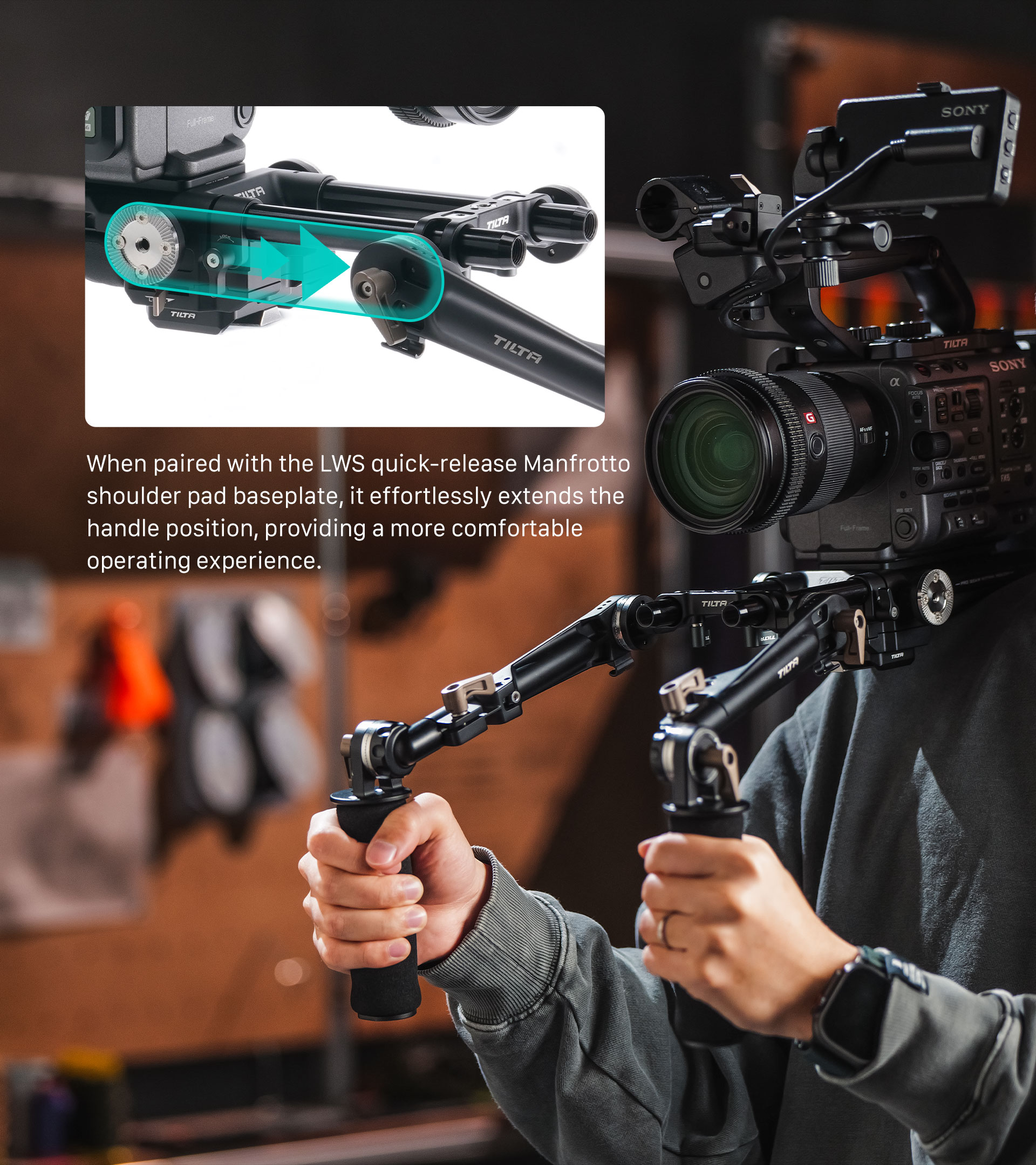 Dies ist ideal für Benutzer, die Rosettenverlängerungsarme und Handgriffe anbringen möchten, um ein Schulter-Rig-Setup zu erreichen, ohne ein eigenständiges Schulter-Rig zu benötigen.