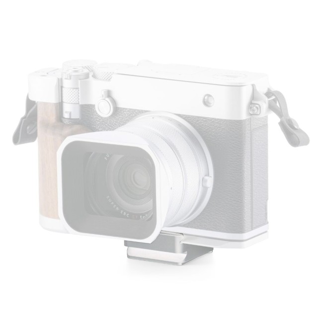 Diese ARCA-Schnellwechselplatte kann direkt an der Unterseite der Montagebasis mit Holzgriff für Vintage-Käfige von Tilta befestigt werden, die für die Kameras Fujifilm GFX100RF, X100VI und Leica Q3 bestimmt sind .