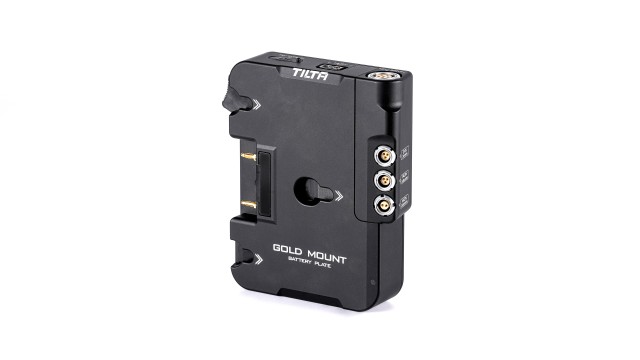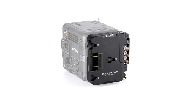 Diese Akkuplatte passt die integrierte V-Mount-Akkuplatte der Sony Burano entweder an eine Gold-Mount- oder V-Mount-Akkuplatte mit zusätzlichen Stromausgängen an.