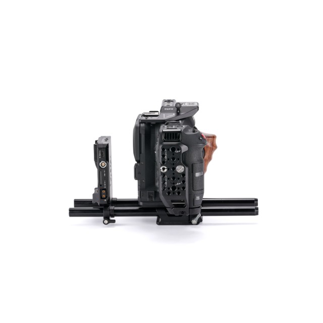 Ein einzigartiges Merkmal dieses Käfigs ist die Seitenplatte mit integrierten Tastenverlängerungen für das Kameragehäuse, die eine taktile Rückmeldung und einen einfachen Zugriff ermöglichen. Auf der gegenüberliegenden Seitenplatte befinden sich präzise ausgerichtete Befestigungspunkte, mit denen die Schnellwechselplatte leicht angebracht und die Kamera in eine vertikale Position gedreht werden kann.