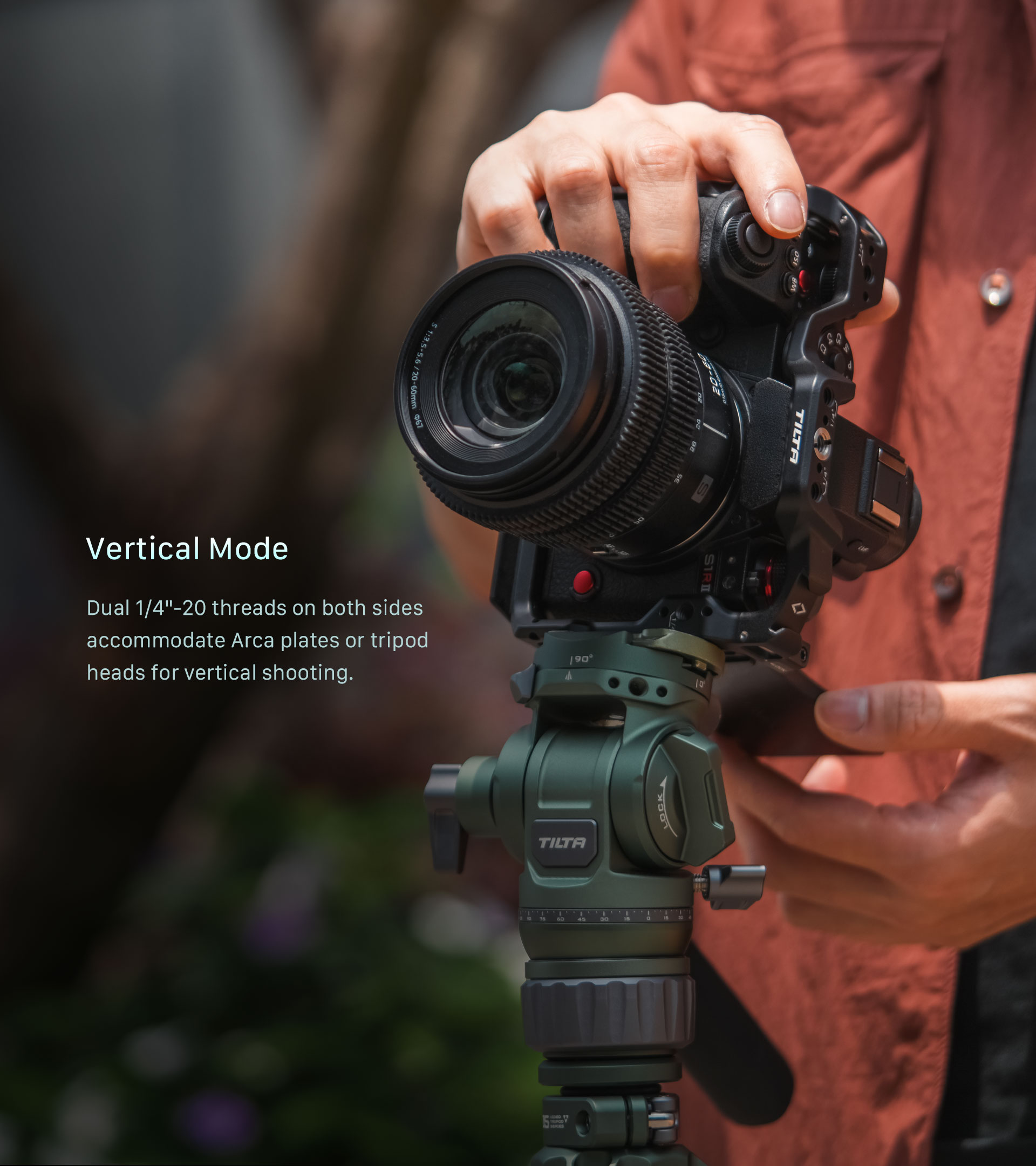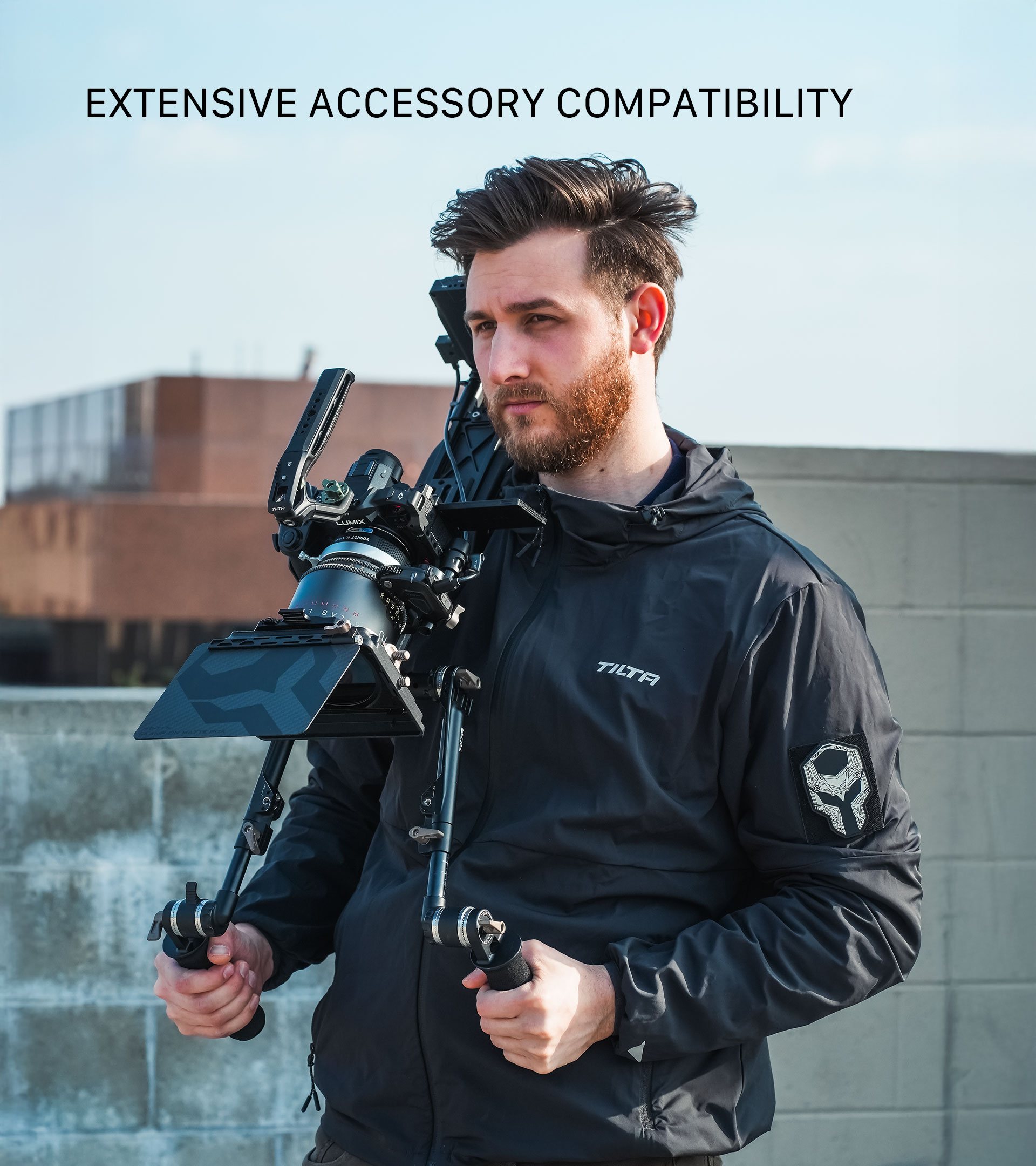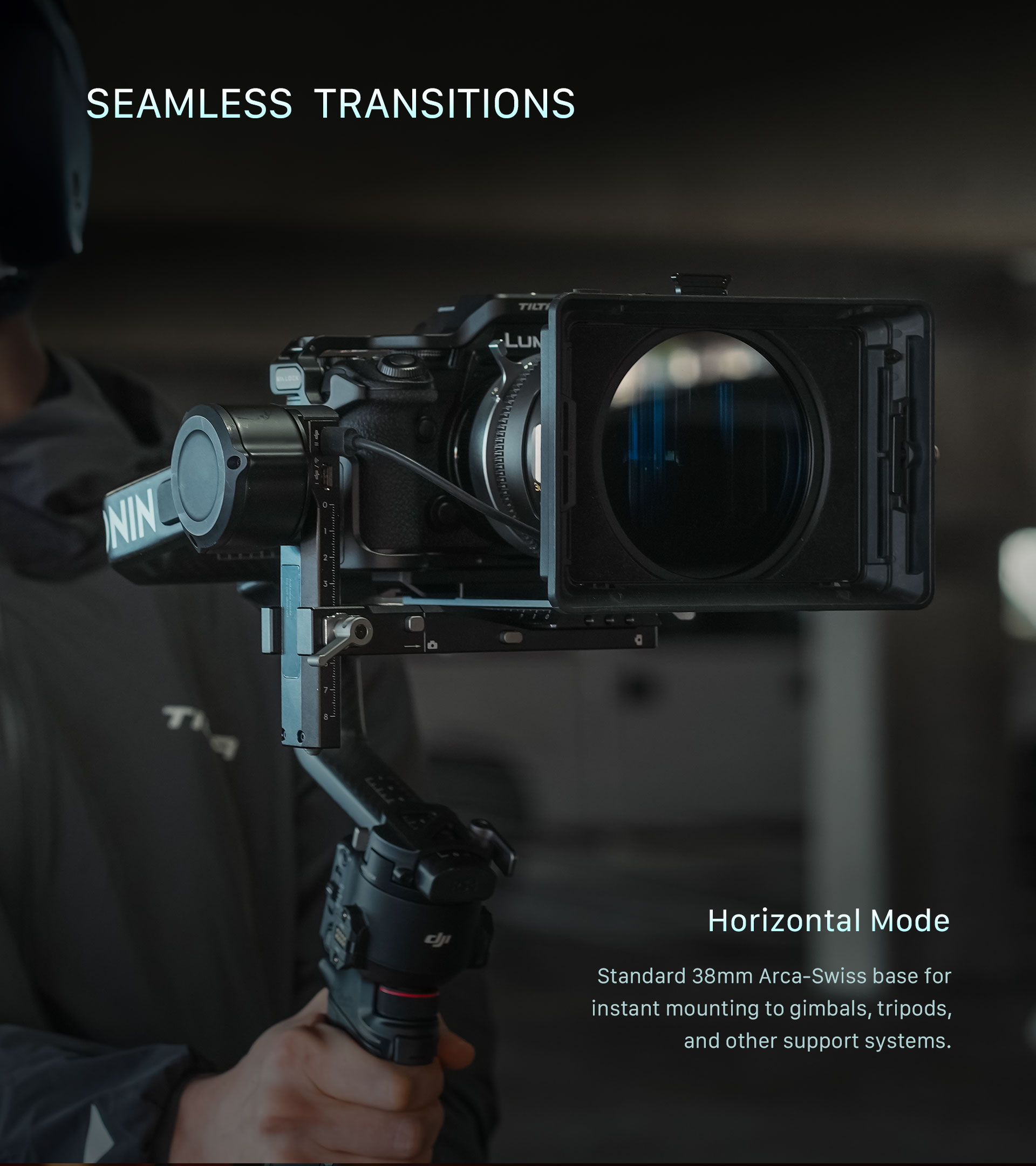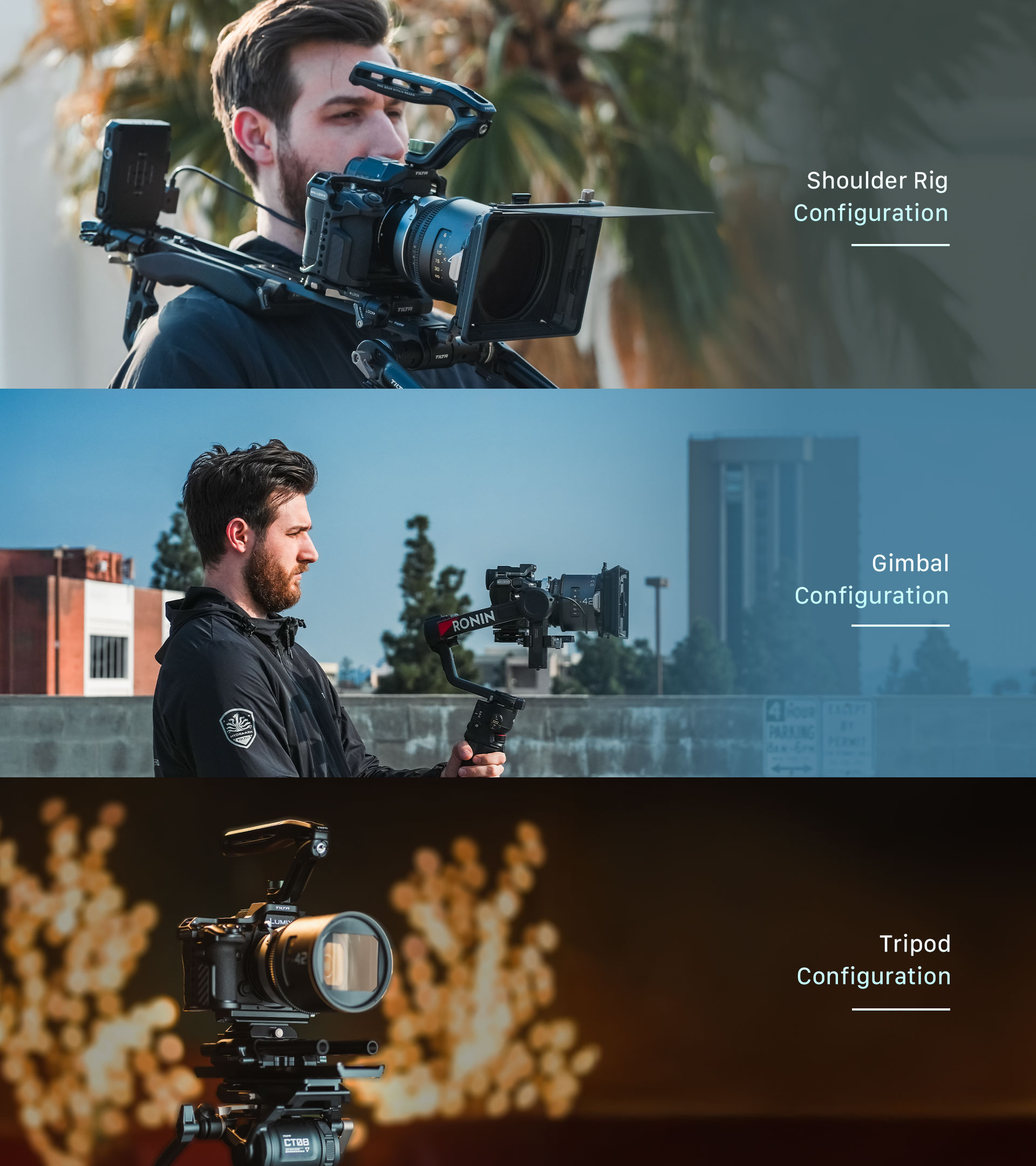Er verfügt über eine ARCA-Bodenplatte, mit der das System einfach an verschiedenen Stativen, Stützsystemen und DJI Ronin-Gimbals wie dem RS4 Pro befestigt werden kann. Befestigungspunkte am Seitenarm ermöglichen die einfache Montage einer ARCA-Schnellwechselplatte (nicht im Lieferumfang enthalten), die einen schnellen Wechsel zu vertikalen Aufstellungen ermöglicht.