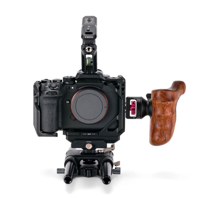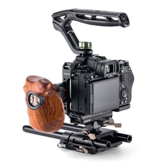 Zum Lieferumfang gehört auch ein ergonomischer Holzgriff, der über 1/4″-20 mit Positionierungsstiften befestigt wird und für mehr Komfort beim Bedienen und Halten der Kamera sorgt. Ein Entriegelungsknopf an der Seite der Halterung macht es einfach, den Winkel des Griffs für die ideale Arbeitsposition einzustellen und bei wechselnden Aufnahmen schnell neu zu positionieren.