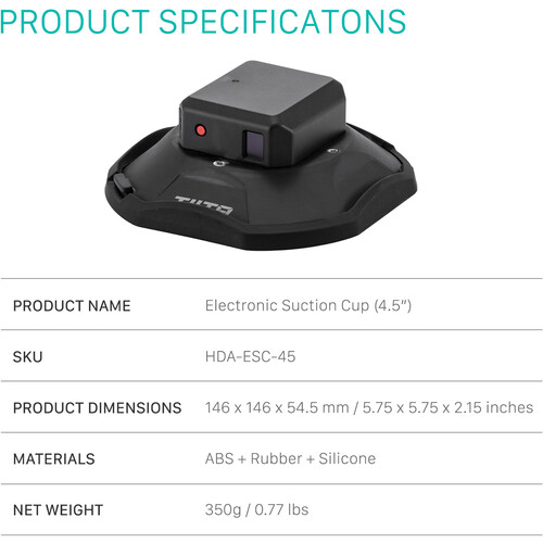 Der elektronische Saugnapf (4,5") von Tilta ist eine leistungsstarke Befestigungslösung für Filmemacher und Fotografen und bietet eine robuste vertikale Tragfähigkeit von 44,1 lbs. Er verfügt über einen leistungsstarken Motor und ein fortschrittliches Luftdruckerkennungssystem, das einen sicheren und zuverlässigen Halt gewährleistet. Der integrierte LCD-Bildschirm ermöglicht die Überwachung in Echtzeit, während die modularen Optionen für die obere Befestigung vielseitige Montagekonfigurationen ermöglichen. Ausgestattet mit einem 2000mAh-Akku und einem USB-C-Ladeanschluss ist dieser Saugnapf sowohl leistungsstark als auch praktisch, perfekt für anspruchsvolle Aufnahmeumgebungen.