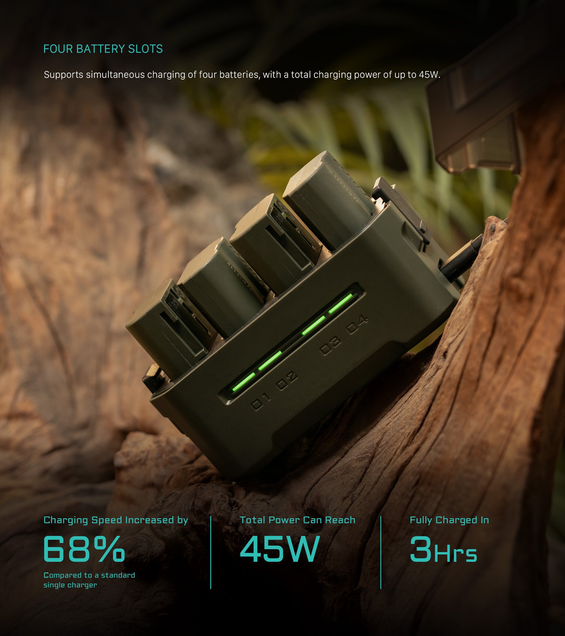Ausgestattet mit 45W PD Fast Charging liefert sie eine beeindruckende, 68% schnellere Ladegeschwindigkeit als ein Standard-Einzel-Ladegerät und stellt sicher, dass Ihre Akkus in nur 3 Stunden wieder einsatzbereit sind.