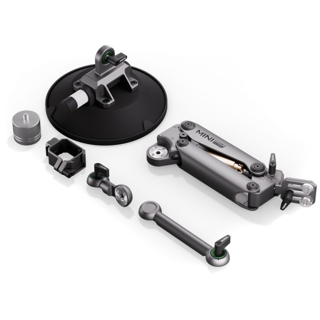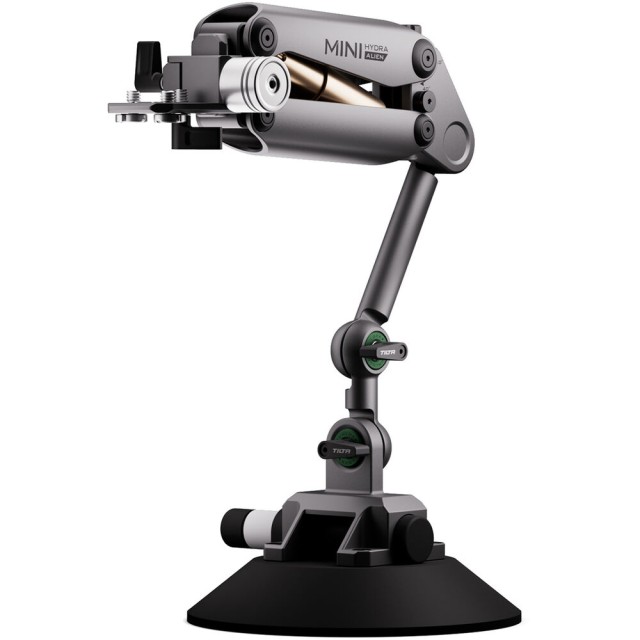 Fangen Sie mit Ihrer Action-Kamera und dem titangrauen Hydra Alien Mini Car Mount Kit von Tilta ruhige Aufnahmen während der Fahrt ein. Diese kompakte, leichte Autohalterung verwendet einen stoßabsorbierenden Arm, um Ihre Kamera an einem Auto oder einem anderen Fahrzeug zu befestigen. Sie umfasst eine 6-Zoll-Saugnapfhalterung, einen Verlängerungsarm, ein Gegengewicht und eine weiche Tragetasche.