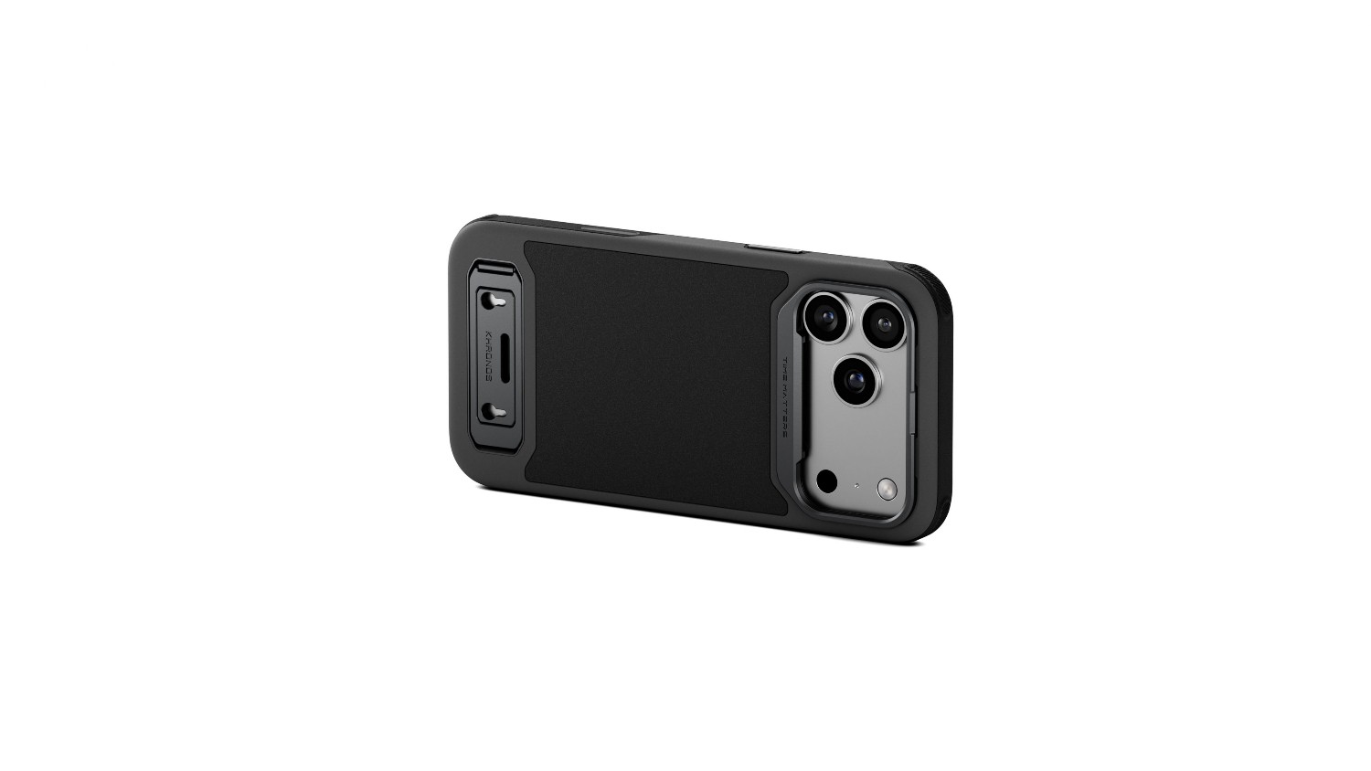 Das Tilta Khronos Lite Case in Schwarz ist eine leichte, professionelle Schutzhülle für das iPhone 17 Pro Max. Es verfügt über einen integrierten Ständer für freihändiges Betrachten, eine magnetische Rückseite zum Anbringen von Zubehör und verstärkten Schutz für die Kamera und die Ecken.