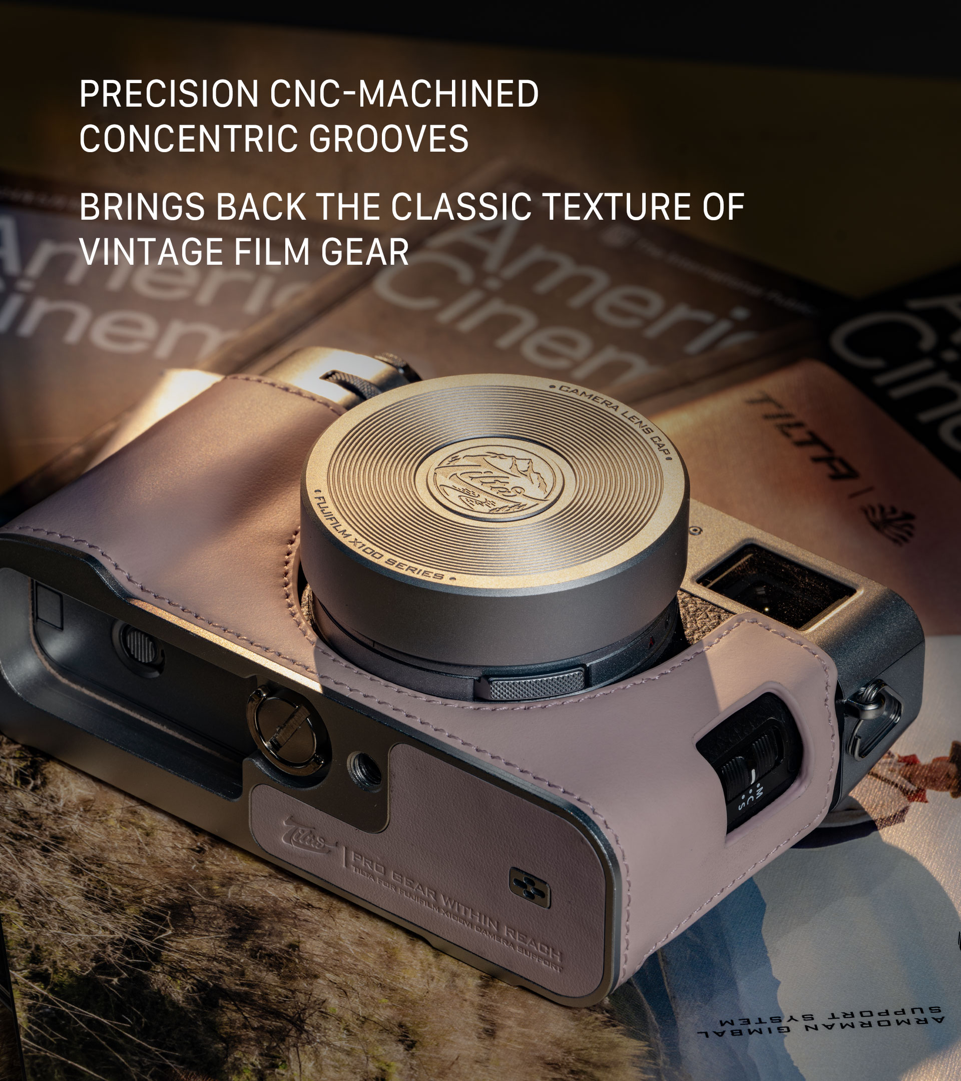 Der mit präziser CNC-Bearbeitung gefertigte Objektivdeckel verfügt über fein detaillierte konzentrische Rillen, die sich angenehm anfühlen und an die klassische Eleganz alter Filmkameras erinnern.