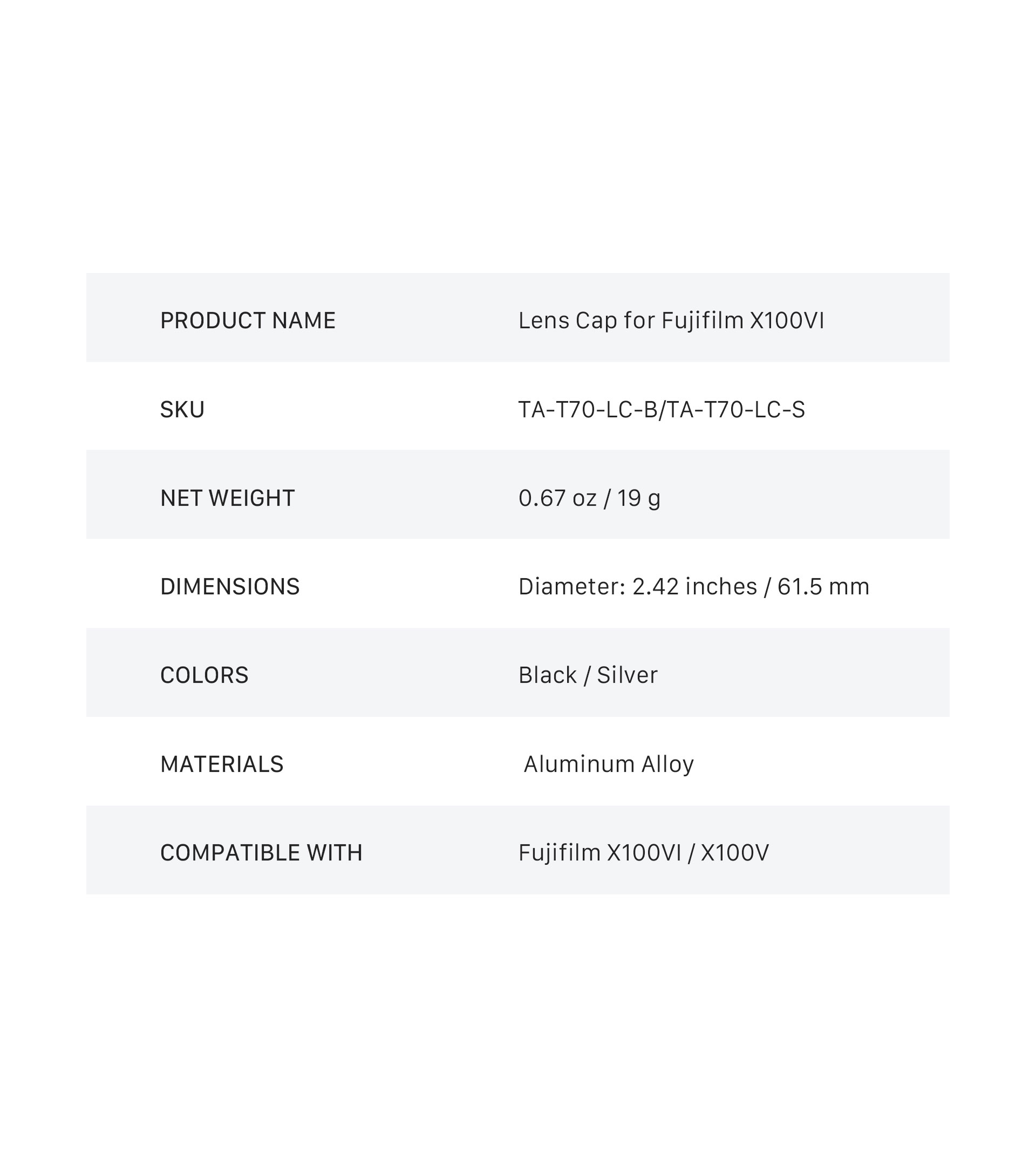 Schützen Sie Ihre Fujifilm X100VI oder X100V stilvoll mit unserem hochwertigen Objektivdeckel, bei dem moderne Handwerkskunst auf Vintage-Charme trifft. Mit einem Gewicht von nur 19 g (0,67 oz) ist dieser leichte und dennoch robuste Deckel so konzipiert, dass er nahtlos auf das Objektiv Ihrer Kamera passt und es schützt.