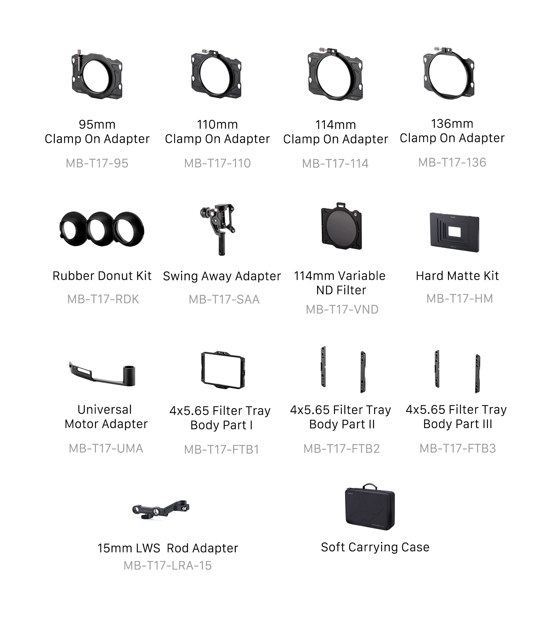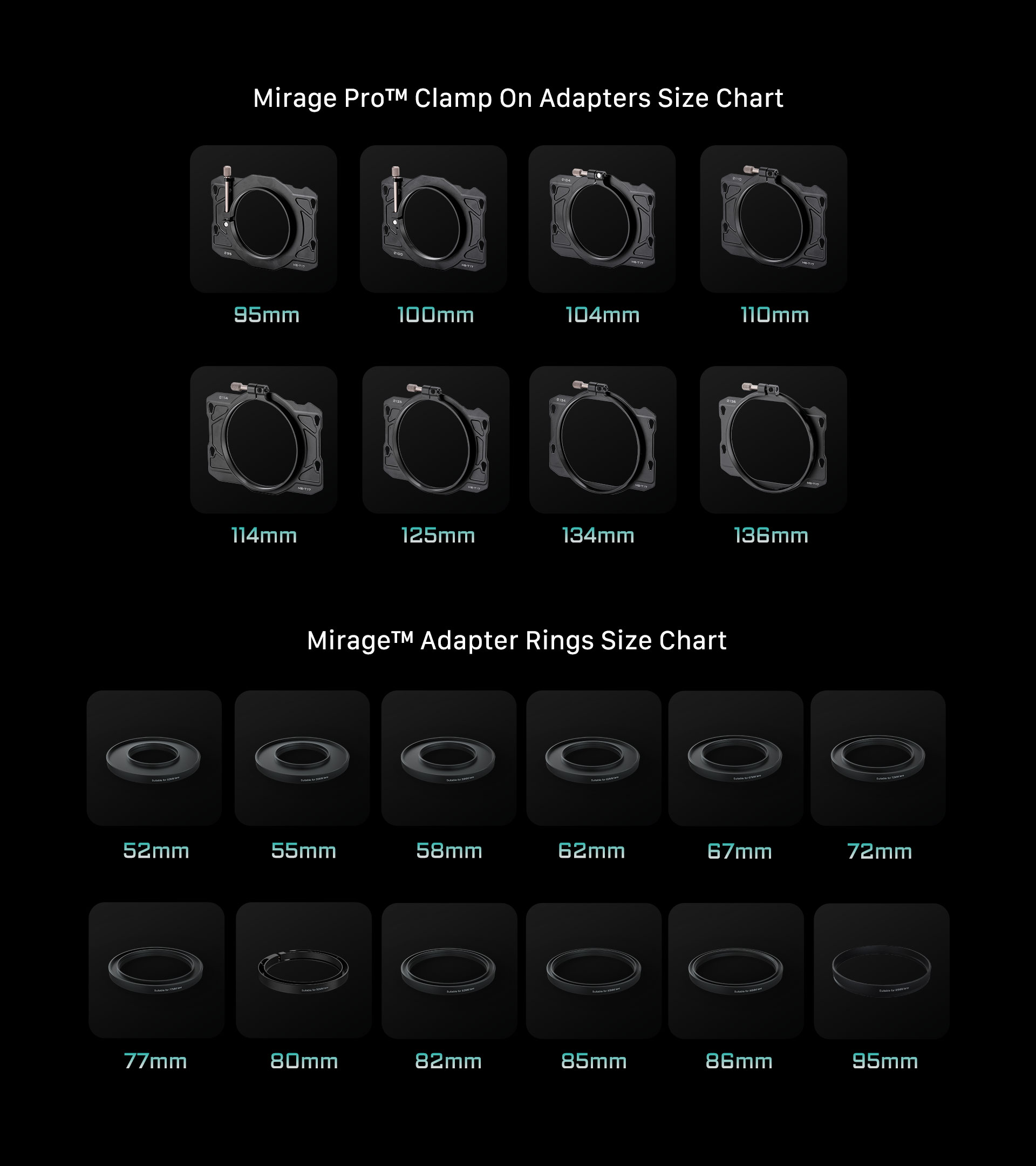 Die mit viel Liebe zum Detail gefertigte Mirage Pro Matte Box wurde für verschiedene Objektivgrößen entwickelt und unterstützt Objektive mit einem Außendurchmesser von 95 mm, 110 mm, 114 mm und 134 mm sowie Fotoobjektive mit den folgenden Filtergewindeadaptern: 67mm, 72mm, 77mm, 82mm.