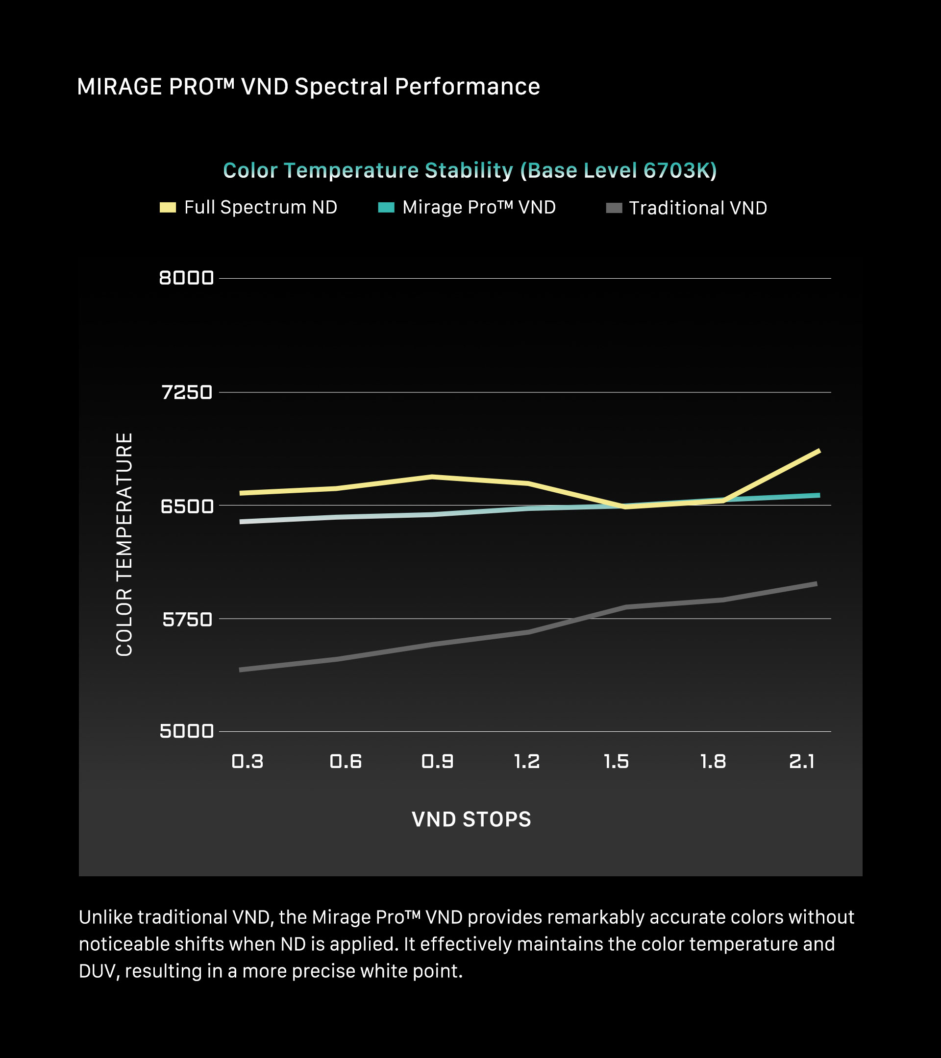 Das VND-Kit enthält einen 114 mm großen variablen ND-Filter, der das Licht um 1 bis 7 Blendenstufen reduziert. Dies ermöglicht dem Benutzer eine einfache und präzise Steuerung der Belichtung.