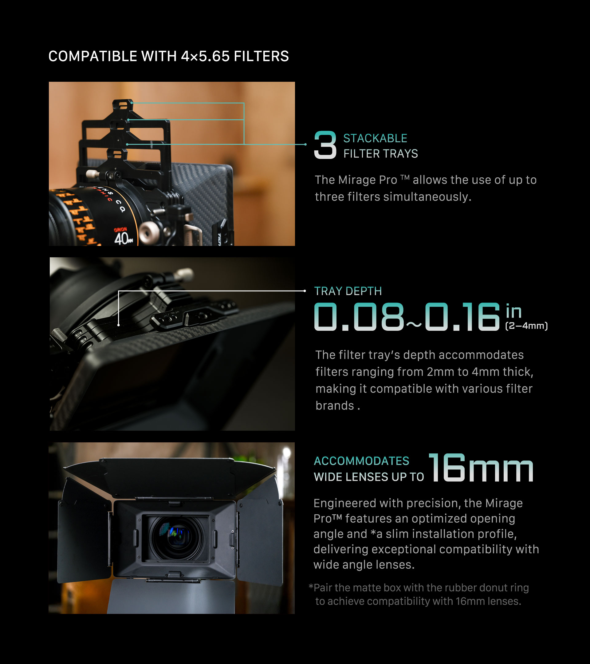 Die Mirage Pro Matte Box ist unsere nächste Generation von leichten Matte Boxen, die sowohl für Anfänger als auch für erfahrene Profis geeignet sind.