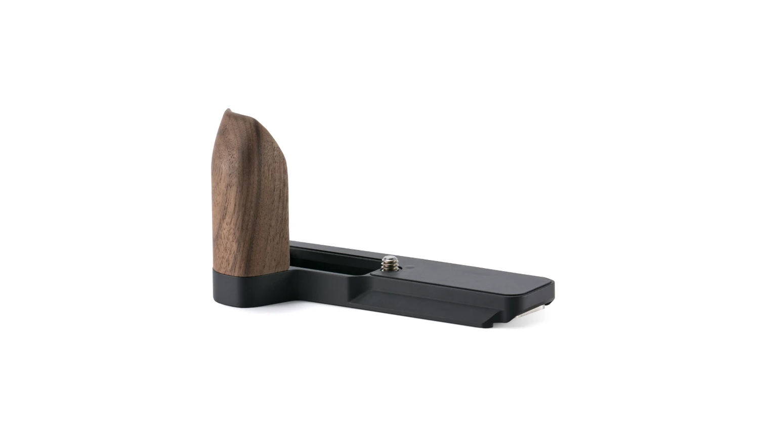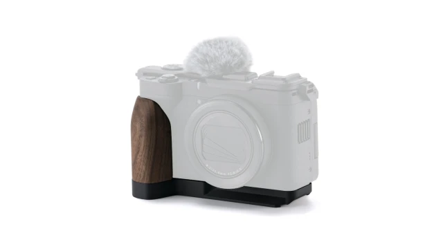 Wir stellen vor: die Montageplatte mit Holzgriff für die Canon PowerShot V1. Die Basis dieses L-förmigen Zubehörteils ist ein Handgriff aus Walnussholz. Dieser sorgt für eine bequemere Bedienung und Handhabung der Kamera, während sie gleichzeitig kompakt und reisefreundlich bleibt.