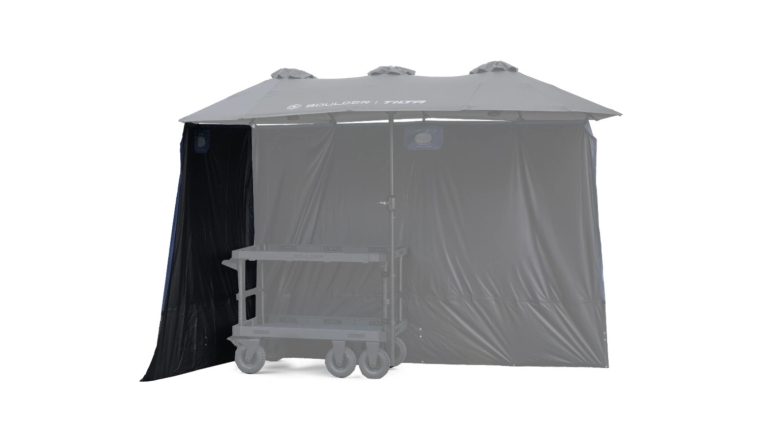 Der Tilta-Sonnenschutz für den Boulder Camera Cart Extended Umbrella (2-teilig) bietet eine modulare seitliche Abdeckung, um Blendung und Reflexionen zu reduzieren und so eine kontrollierte, abgedunkelte Video-Village-Umgebung für professionelle Überwachung am Set zu schaffen.