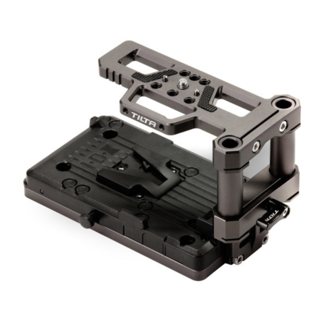 Die V-Mount-Batteriegrundplatte wird direkt an der Unterseite der halben und vollen Kamerakäfige befestigt.
