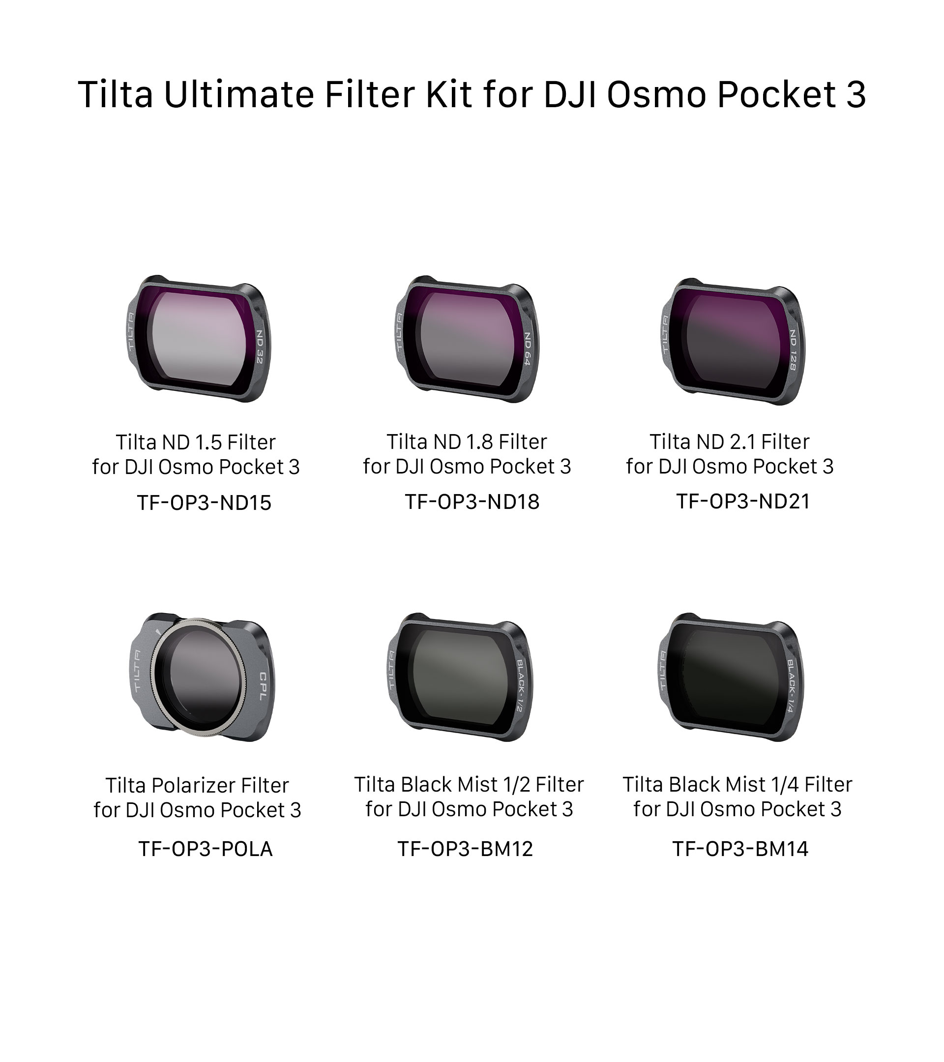 Dieses Kit enthält: 1x Circular Polarizer Filter, 2x Black Mist Filter (1/2, 1/4), 3x ND Filter (1.5, 1.8, 2.1). Die Filter wurden speziell für die Pocket 3 entwickelt und verfügen über eine magnetische Verbindung für eine mühelose Verbindung, während das gerillte Quick-Release-Design einen schnellen Zugriff durch Einklemmen und Entfernen ermöglicht.