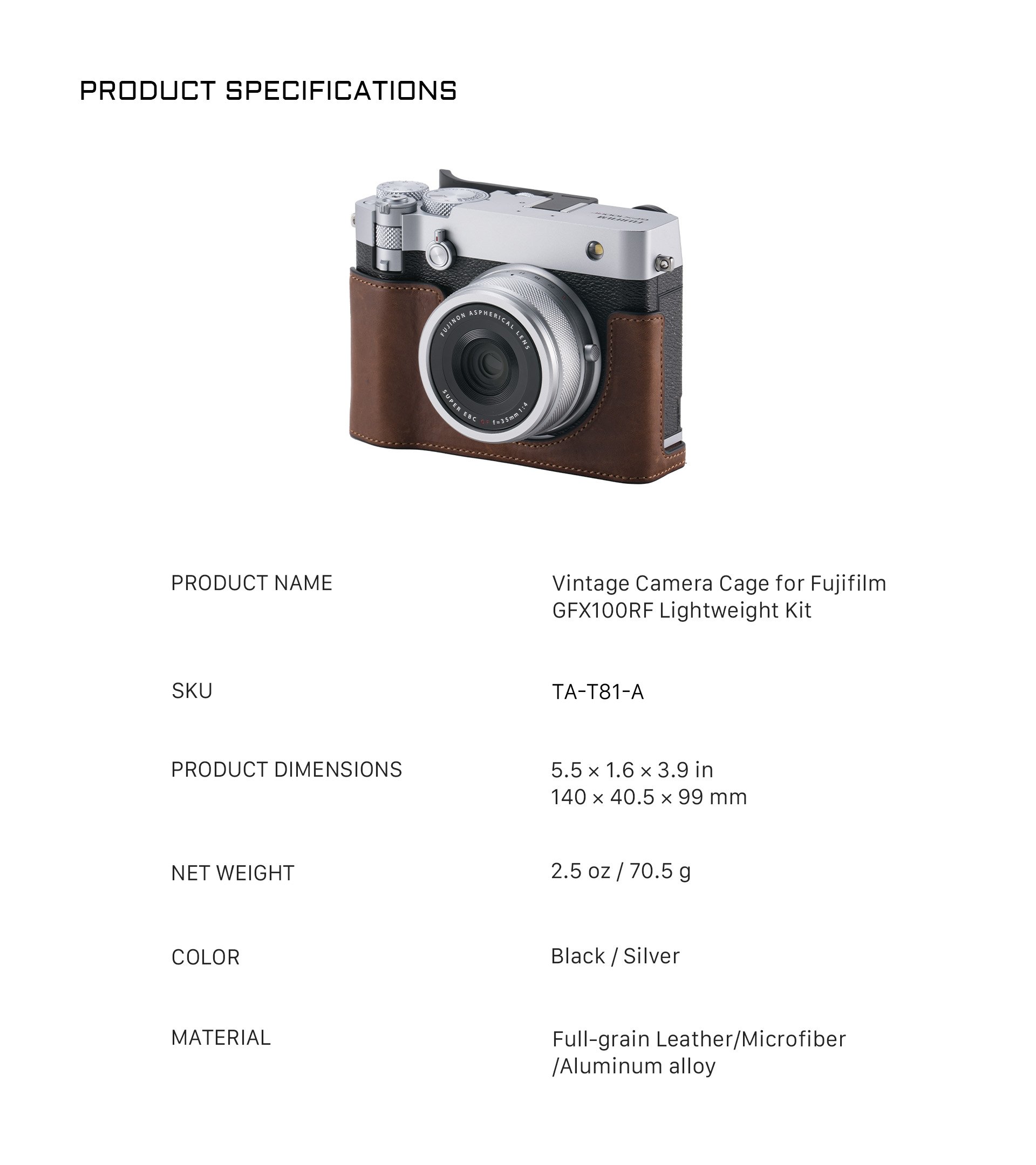 Wir stellen vor: den Vintage-Kamerakäfig für das Fujifilm GFX100RF Lightweight Kit. Dieses Kit enthält eine Lederkamera-Tasche für die Fujifilm GFX100RF, die mit einer 1/4″-20-Schraube befestigt wird und dem Benutzer durch den integrierten Handgriff eine bequemere Bedienung und Handhabung des Kameragehäuses ermöglicht.