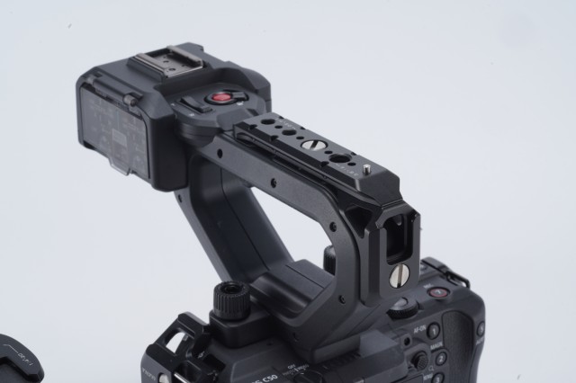 Dieses mechanische Zubehörteil wird am originalen XLR-Obergriff für die Canon C50 befestigt. Es bietet zusätzliche Befestigungspunkte für Zubehör wie eine integrierte NATO-Schiene und einen Blitzschuh-Empfänger.