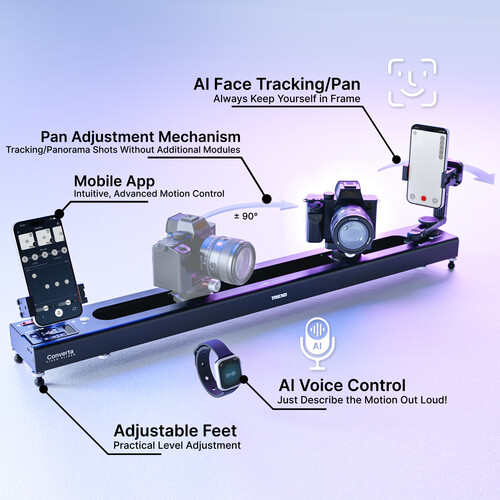 Der Trexo Converta 600 Essential ist ein leistungsstarker, KI-unterstützter motorisierter Kamera-Slider mit 90°-Schwenk, Gesichtsverfolgung und Sprachsteuerung. Mit einem erweiterten Verfahrweg von 25,6" und einer Tragfähigkeit von 22 lb ist er für professionelle Bewegungen in horizontalen und vertikalen Setups ausgelegt.