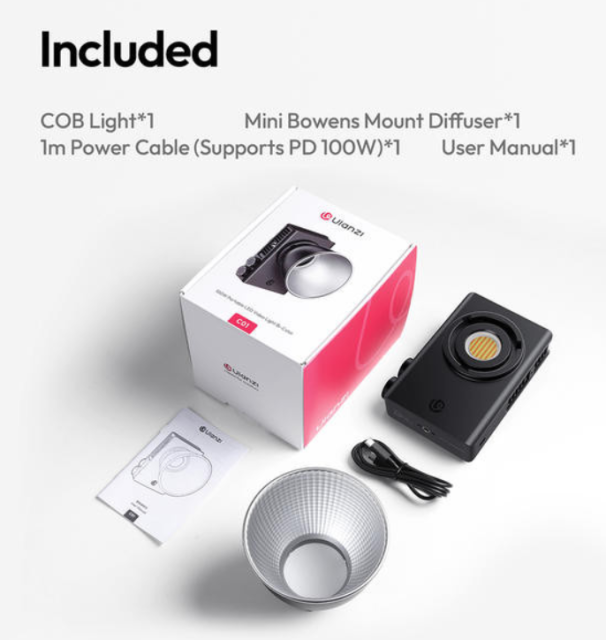 Die Ulanzi L099 C01 100W COB LED-Videoleuchte vereint Tragbarkeit und professionelle Leistung in einem schlanken, ultraschlanken Design. Mit einem Gewicht von nur ca. 330 g (ca. 390 g mit Standardreflektor) passt sie problemlos in Ihre Tasche oder Kameratasche und ist somit ideal für Aufnahmen unterwegs. Trotz ihrer kompakten Größe liefert diese Leuchte eine helle, einstellbare zweifarbige Beleuchtung mit 100 W und einem Abstrahlwinkel von 120°, wodurch sie sich sowohl für Nahaufnahmen als auch für die Ausleuchtung großer Flächen eignet.
