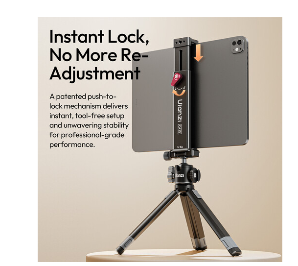 Die Ulanzi CA15 OneLock Tablet-Klemme ist eine professionelle Befestigungslösung, die Tablets mit einer Größe von 7,9 bis 12,9 Zoll sicher hält. Sie wurde speziell für Kreative, Pädagogen, Streamer und Profis entwickelt und bietet eine stabile und anpassungsfähige Plattform für die Verwendung von Tablets mit Stativen, Ständern und Kamerarigs.