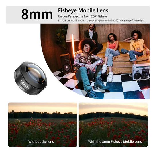 Halten Sie dramatische, ultraweite Perspektiven mit dem Ulanzi CL-004 8-mm-Fischaugenobjektiv fest. Mit einem enormen Blickwinkel von 200° und hochwertigem optischem Glas eignet sich dieses Aufsteckobjektiv perfekt für kreative Fotografie, Vlogging, Actionaufnahmen und beeindruckende Bilder auf iPhone-, Samsung- und Android-Smartphones.