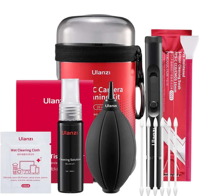 Das Ulanzi CO26 APS-C Kamera-Reinigungsset ist eine Komplettlösung für die sichere Pflege Ihrer Kamera und Objektive. Dieses speziell für APS-C-Sensoren entwickelte All-in-One-Set enthält feuchte Sensortücher, Mikrofasertücher, einen Staubbläser, einen Objektivreinigungstift und Reinigungsflüssigkeit – alles ordentlich verpackt in einem kompakten Reiseetui, das sich überall leicht verwenden lässt.