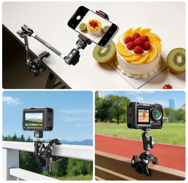 Die robuste Superklemme verfügt über ein 3-Backen-Design, das einen festen Halt sowohl auf flachen als auch auf runden Oberflächen gewährleistet, während der mitgelieferte Magic Arm mit zwei Kugelgelenken eine vollständige 360°-Positionierung ermöglicht. So lassen sich kreative Blickwinkel wie Aufnahmen von oben, Beleuchtung aus niedriger Perspektive oder seitlich montierte Monitor-Setups ganz einfach realisieren.