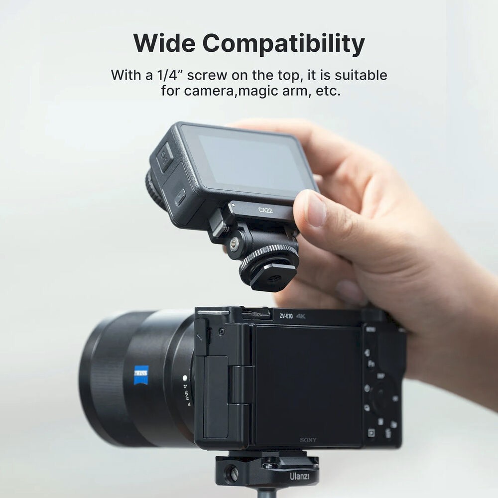 Eine integrierte 1/4"-20-Gewindebasis erweitert die Kompatibilität der Befestigung, sodass der Adapter für eine Vielzahl von professionellen Rigs und Zubehörteilen verwendet werden kann. Ob beim Vloggen, beim Filmen von Action-Aufnahmen oder beim Aufbau einer kompakten Kameraausrüstung – dieser Cold-Shoe-Adapter bietet Zuverlässigkeit, Flexibilität und Komfort.