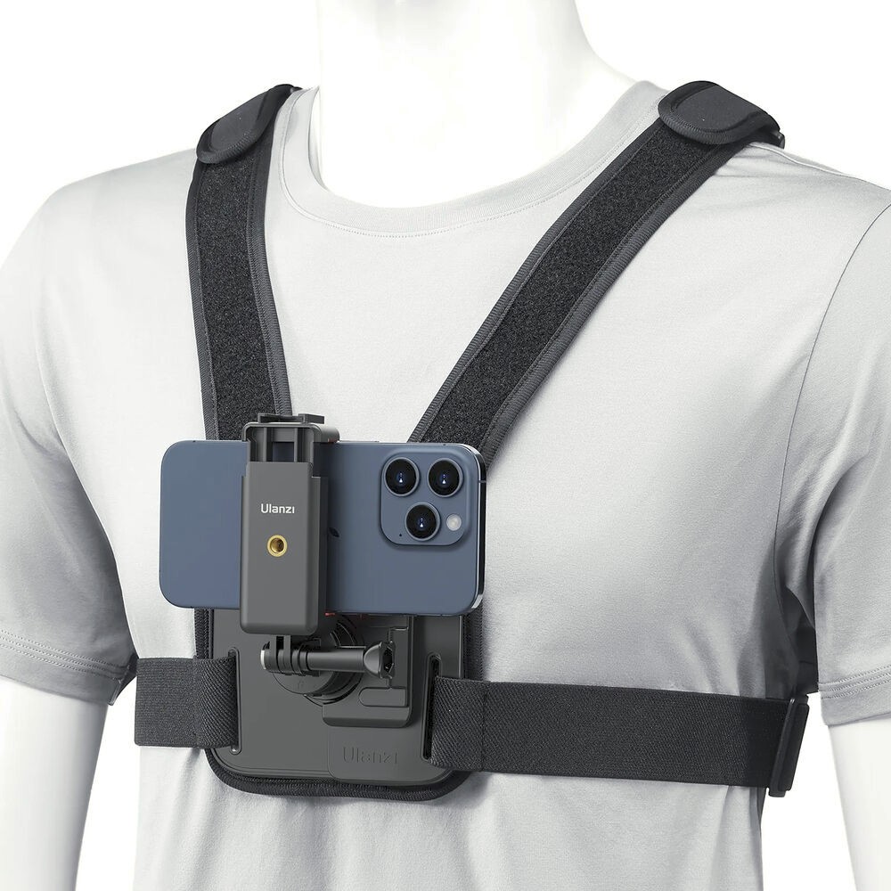 Der magnetische Brustgurt Ulanzi Go-Quick II ermöglicht freihändiges Filmen aus der Ich-Perspektive mit Actionkameras oder Smartphones mit einer Breite von bis zu 3,54 Zoll. Er ist für alle Erwachsenengrößen verstellbar und verfügt über eine 1/4"-20-Gewindeschraube, eine Kaltschuhhalterung, eine 360°-Drehung und eine 180°-Neigung für vielseitige Aufnahmewinkel.
