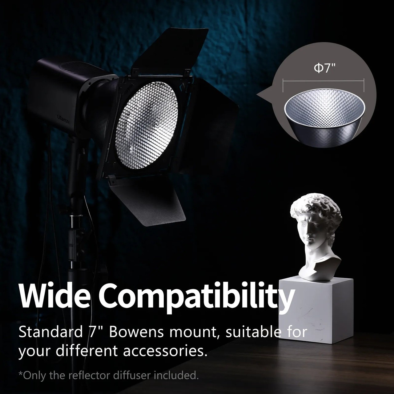 Der Ulanzi HT002 7" Standard Bowens Mount Reflektor-Diffusor ist ein leichter und robuster Aluminiumreflektor, der für Bowens-Mount-Leuchten entwickelt wurde. Seine reflektierende silber- und weiß lackierte Innenseite sorgt für gleichmäßiges, weiches Licht und ist somit ideal für Fotografie, Videografie und Aufnahmen unterwegs.