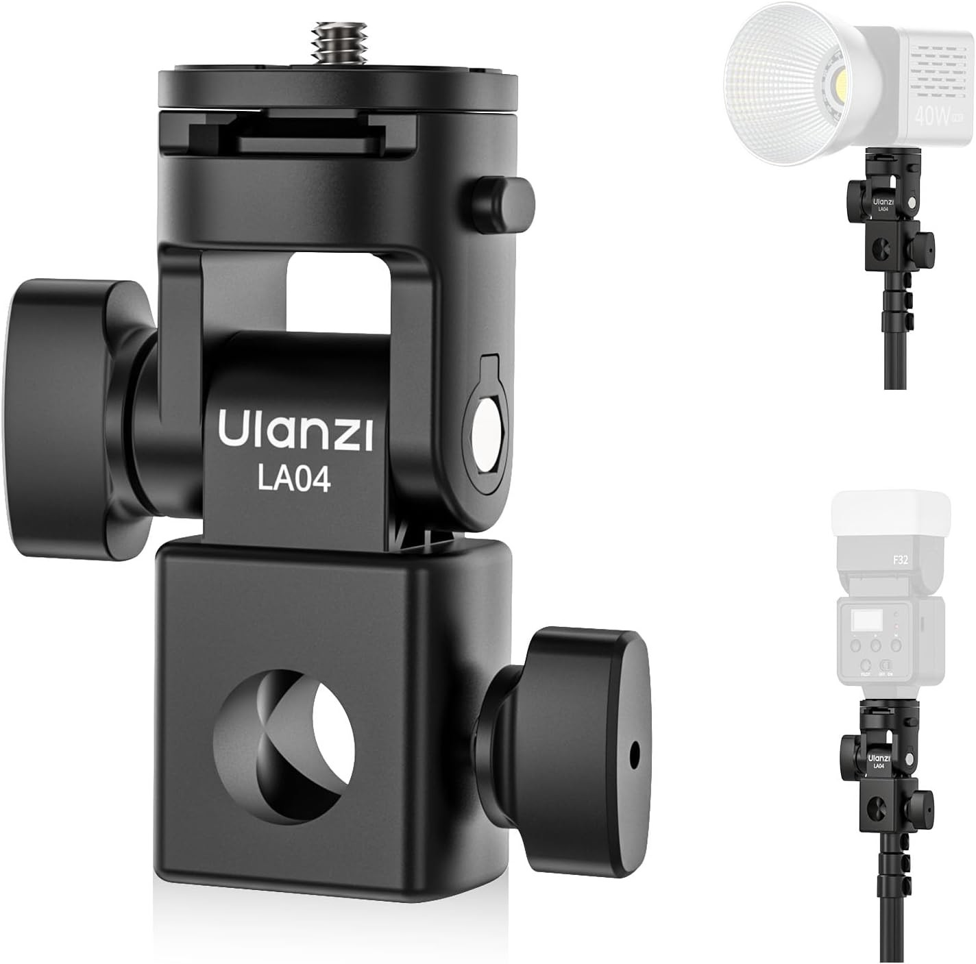 Der Ulanzi LA04 Lichtstativadapter ist ein kompaktes, vielseitiges Zubehörteil, mit dem Sie Kameras, Handyhalterungen und Videoleuchten an Standard-Lichtstativen befestigen können. Mit einer 1/4"-Schraube, einer Blitzschuhhalterung und einer 180°-Neigungsverstellung ermöglicht er eine flexible Positionierung für Fotos und Videos und ist dabei leicht und tragbar.