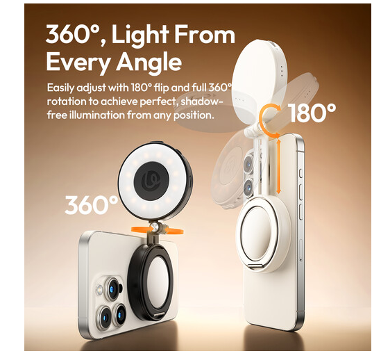 Das innovative Klappdesign ermöglicht eine Neigung um 180° und eine vollständige Drehung um 360°, wodurch eine präzise Positionierung des Lichts möglich ist. Es kann auch als Griff oder Tischständer verwendet werden und eignet sich somit ideal für Webcasts, Telekonferenzen, die Erstellung von Inhalten oder die Wiedergabe von Medien.