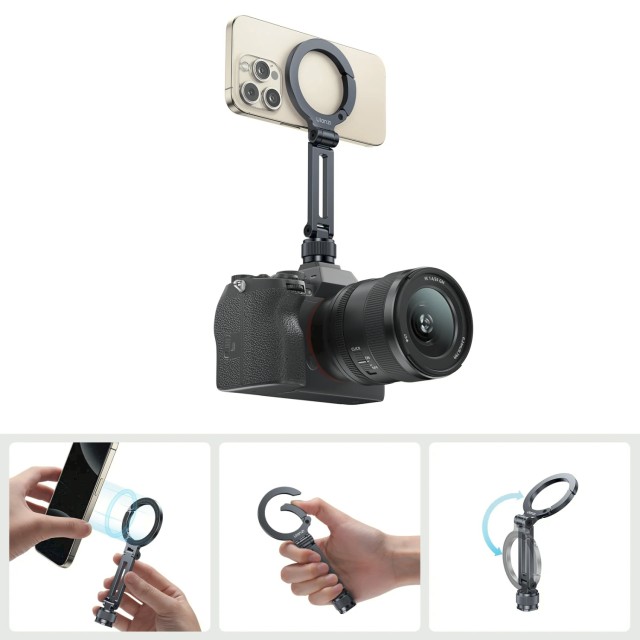 Die Ulanzi MA07 MagLock 1/4 Cold Shoe Bracket ist eine vielseitige, klappbare Handyhalterung und Zubehörhalterung mit einhändig bedienbarem MagSafe-Schnappverschluss, sanfter Dreh- und Neigefunktion sowie universeller Kompatibilität mit 1/4"-20- und Cold Shoe-Anschlüssen. Kompakt, leicht und reisefertig, eignet sie sich ideal für Live-Streaming, Interviews, Aufnahmen mit zwei Bildschirmen und kreative mobile Setups.