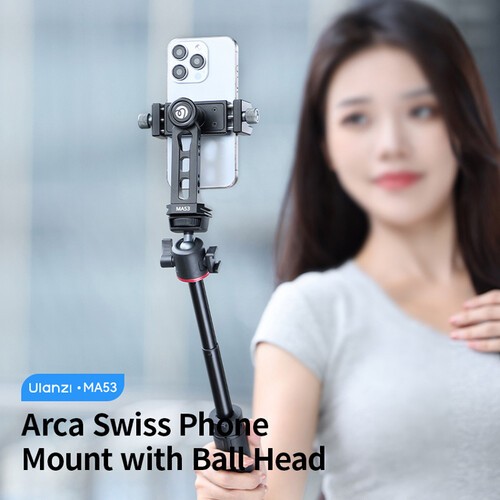 Die Ulanzi MA53 Arca Swiss Phone Mount ist eine robuste Smartphone-Halterung aus Aluminium mit integriertem Kugelkopf und Arca-Schnellwechselplatte. Sie ist für Smartphones mit einer Breite von 2,4 bis 3,7 Zoll ausgelegt und bietet eine reibungslose 360°-Drehung, eine Positionierung in mehreren Winkeln und umfangreiche Erweiterungsmöglichkeiten für Zubehör – ideal für mobiles Filmen, Livestreaming und Fotografie.